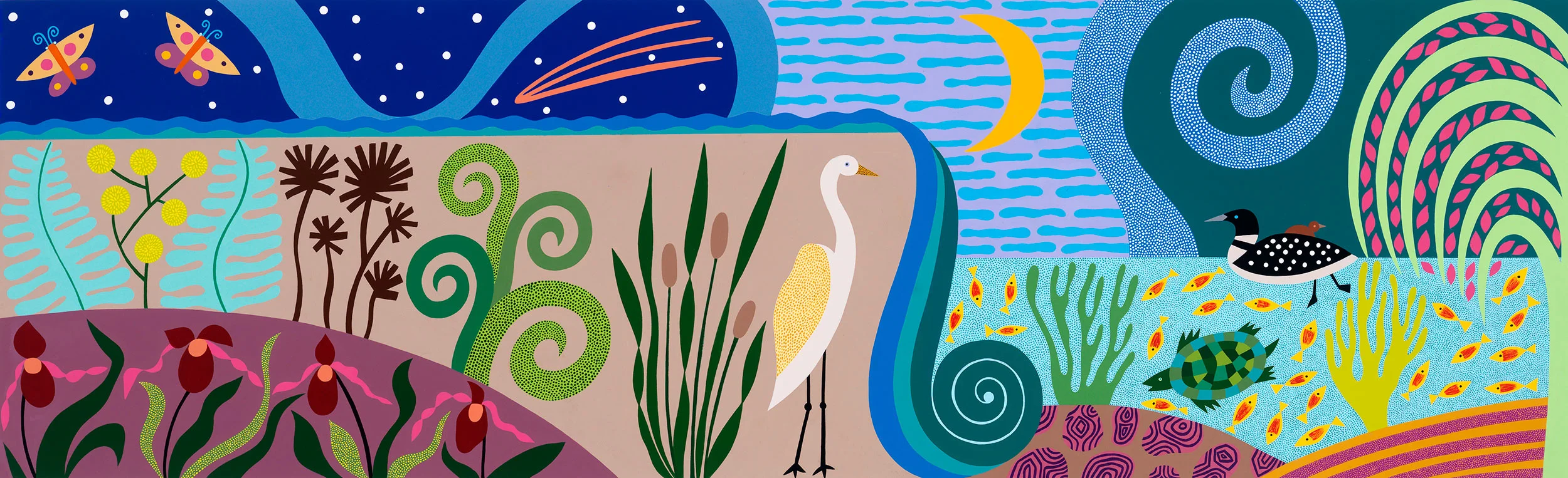 I’ve always enjoyed studying the landscape from a scientific point of view, looking at strata and rocks and mountains and the way the water shapes the land. Whether looking at the world from the air or from underground, I try to create vibrant, active paintings that are full of color and life.